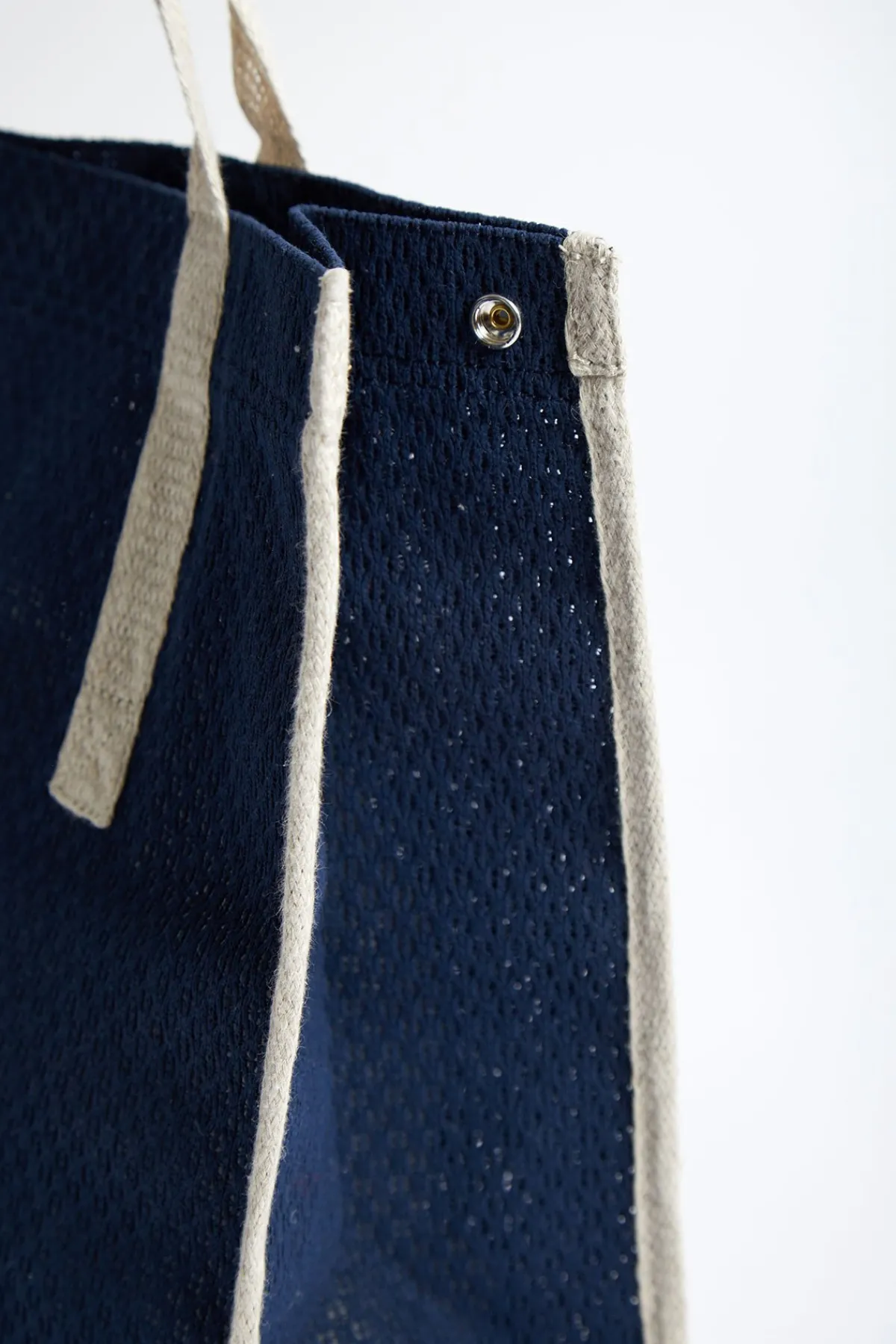 | Détails | • Cabas de plage souple en coton • Coloris bleu marine • Anses écrues • Fermeture par une pression centrale • Dimensions : 35 x 47 cm |
