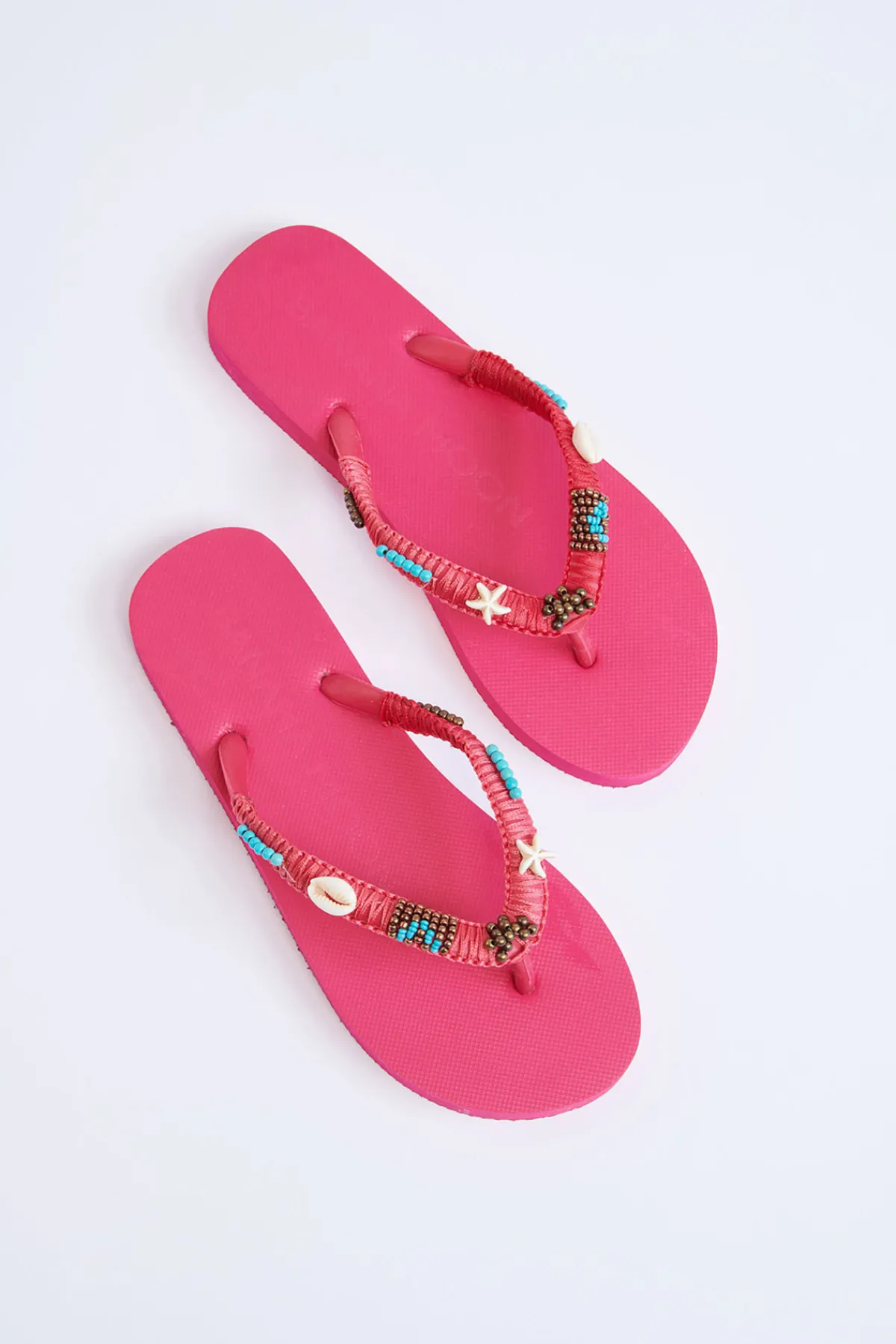 | Détails | • Tongs en caoutchouc • Bride en caoutchouc • Bride ornée de coquillages et perles • Hauteur semelle 1,8 cm |