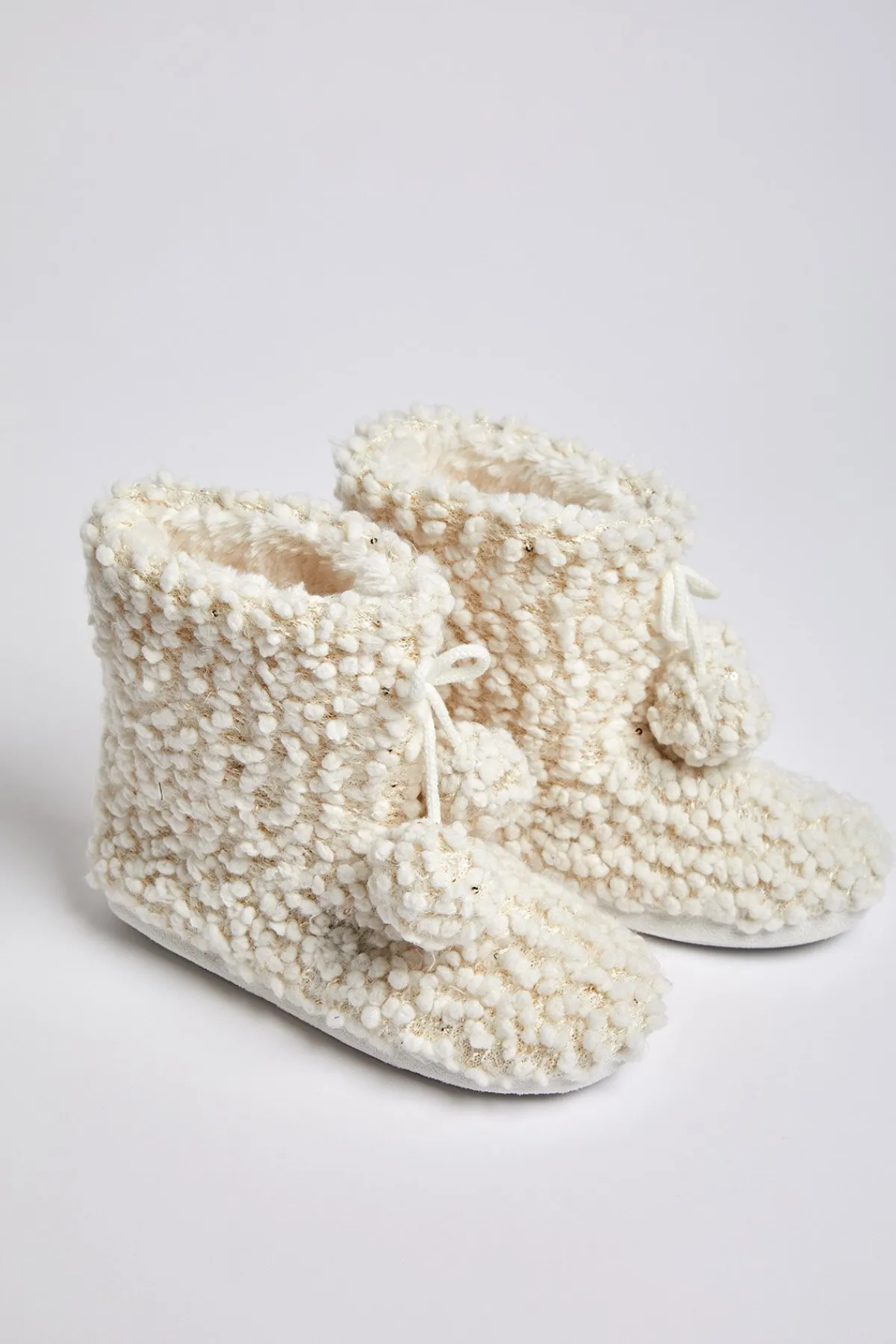 | Détails | • Chaussons bottes femme • Coloris écru • Matière douce • Pompons • Intérieur fourré • Semelle caoutchouc • 3 tailles : 36/37 38/39 40/41 |