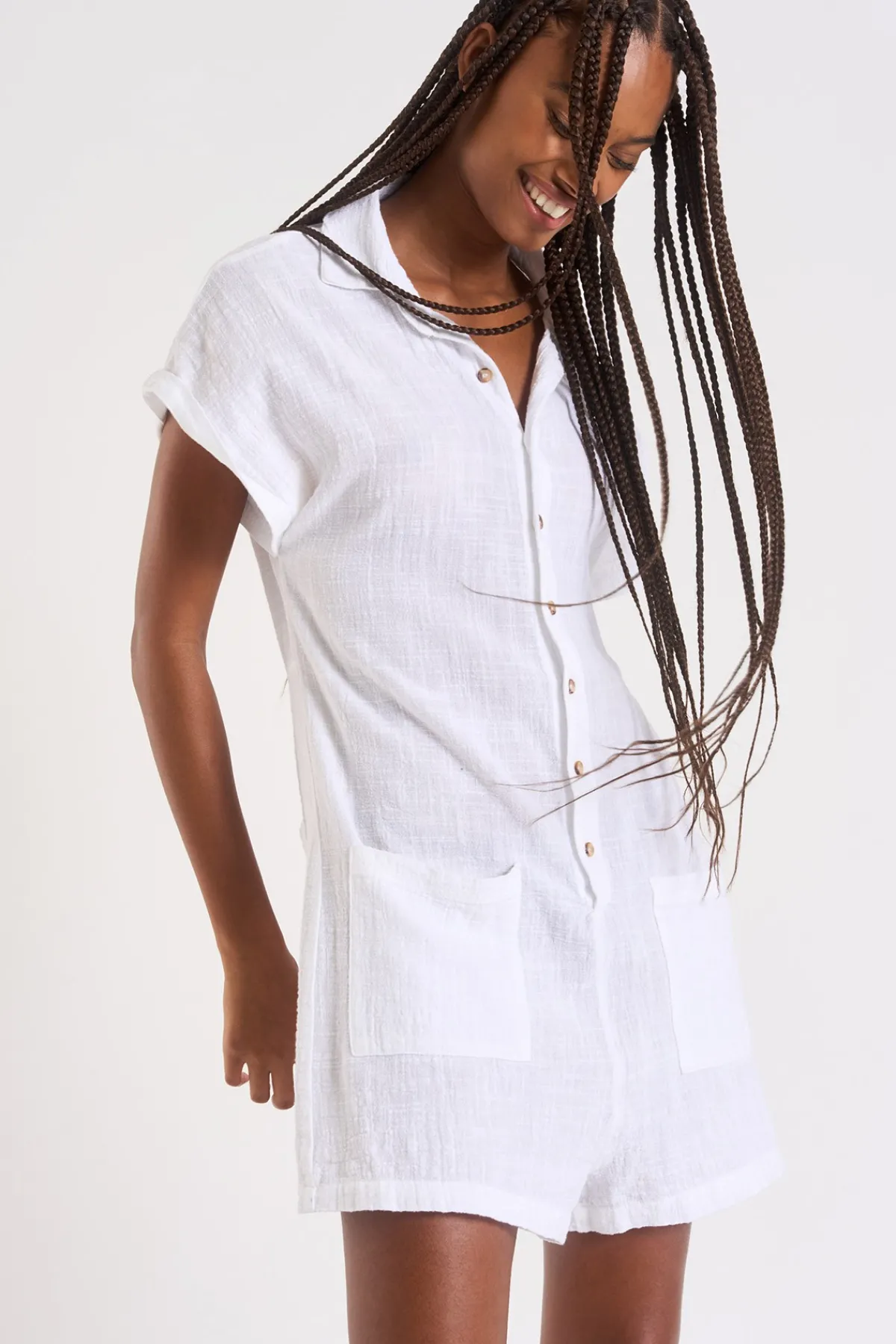 | Détails | • Combishort chemise • Boutons à l’avant • Col chemise • Manches courtes • Unie • Poches à l’avant bas de la robe • 100% coton |