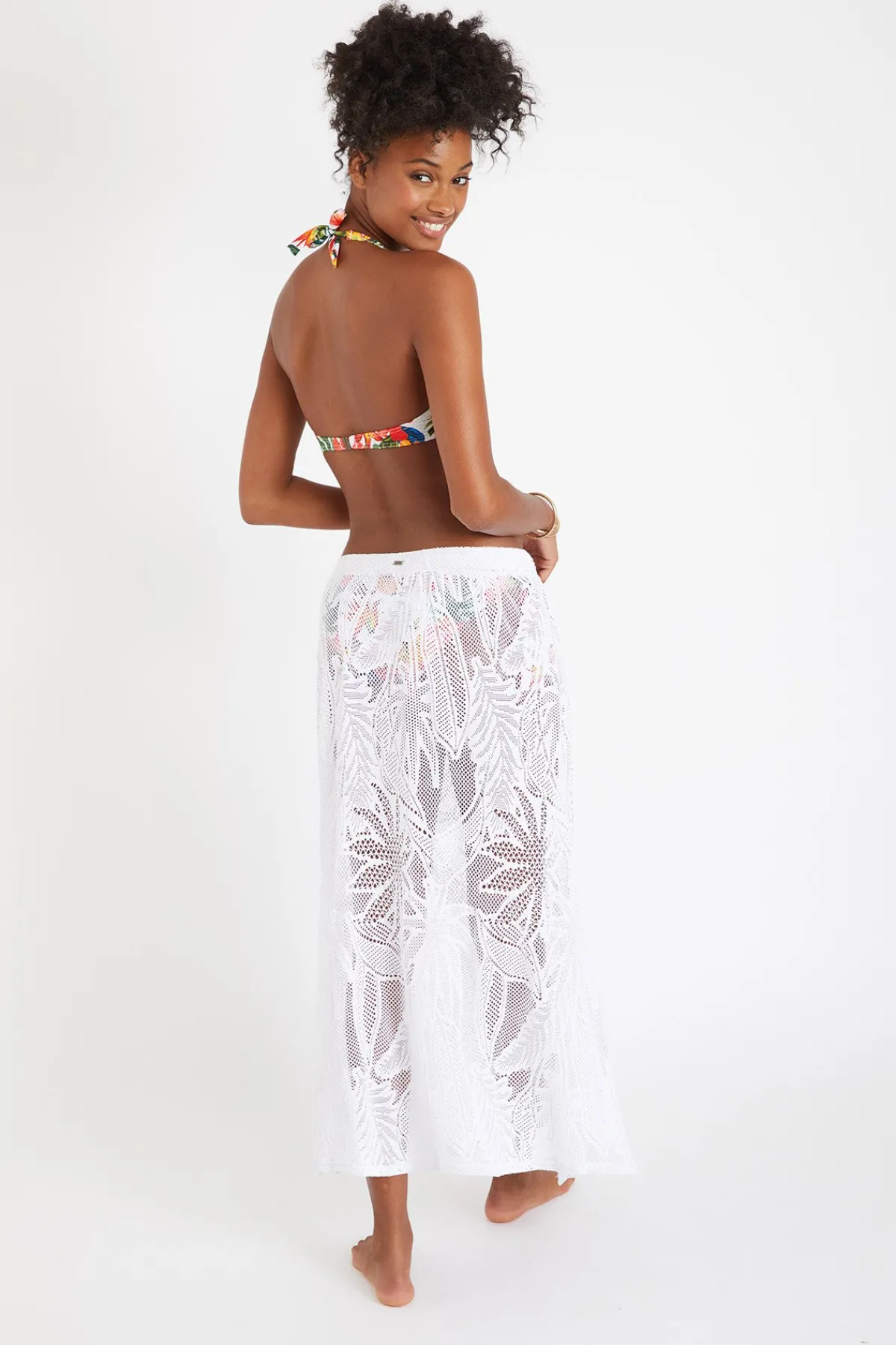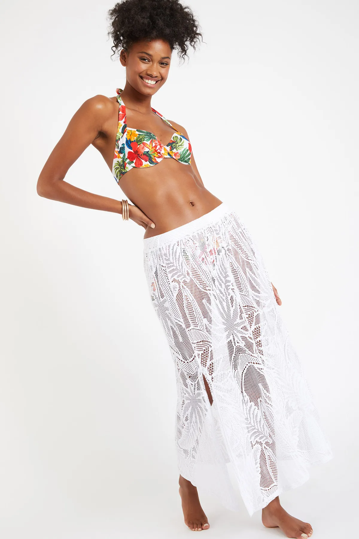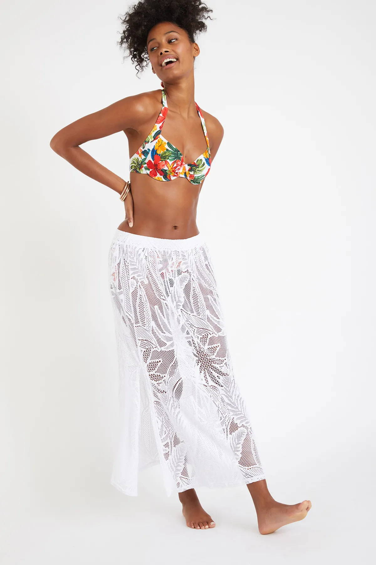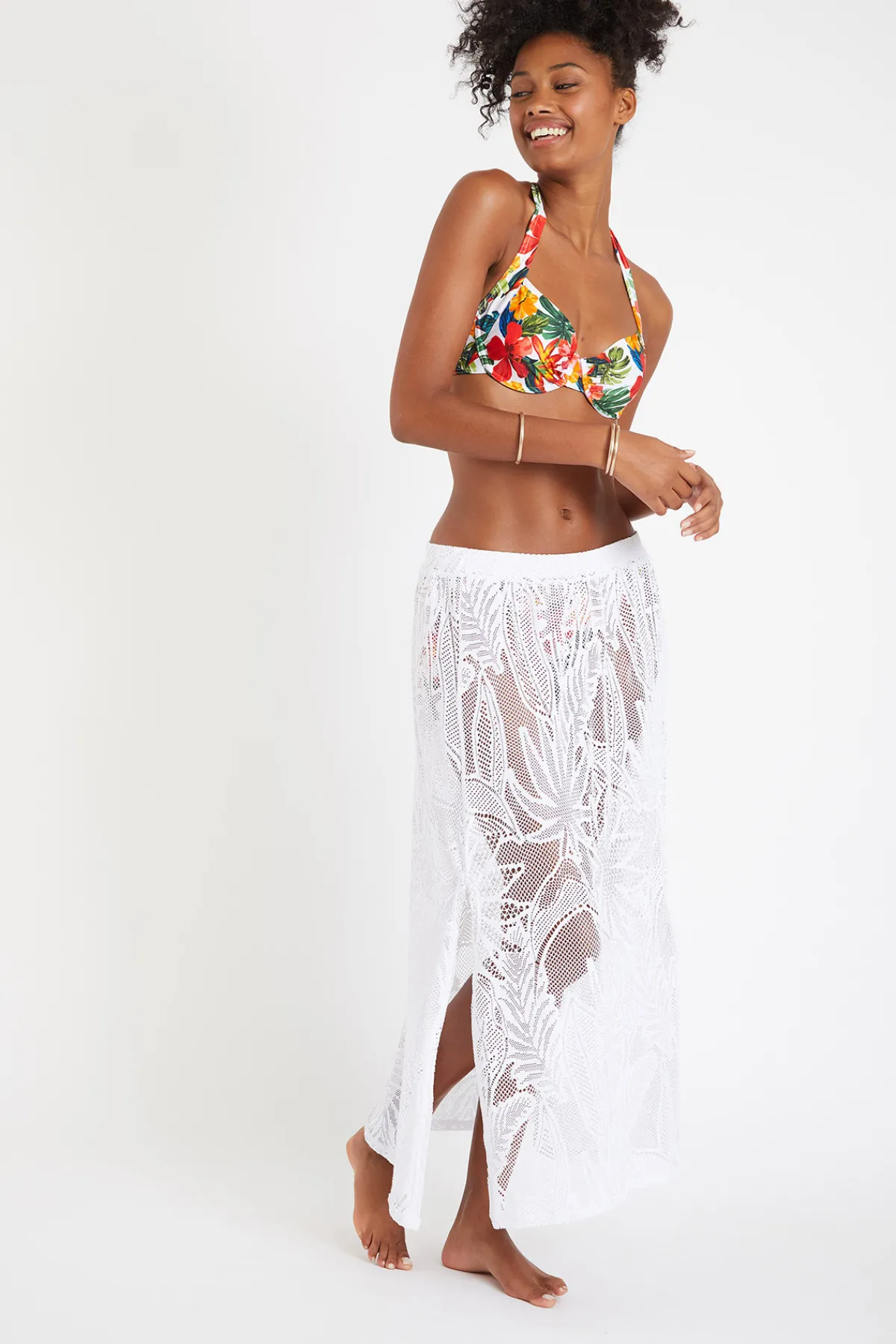 | Détails | • Jupe longue femme • Coloris blanc • Matière ajourée esprit crochet • Fendue sur les côtés • Fluide et légère • Taille élastiquée |