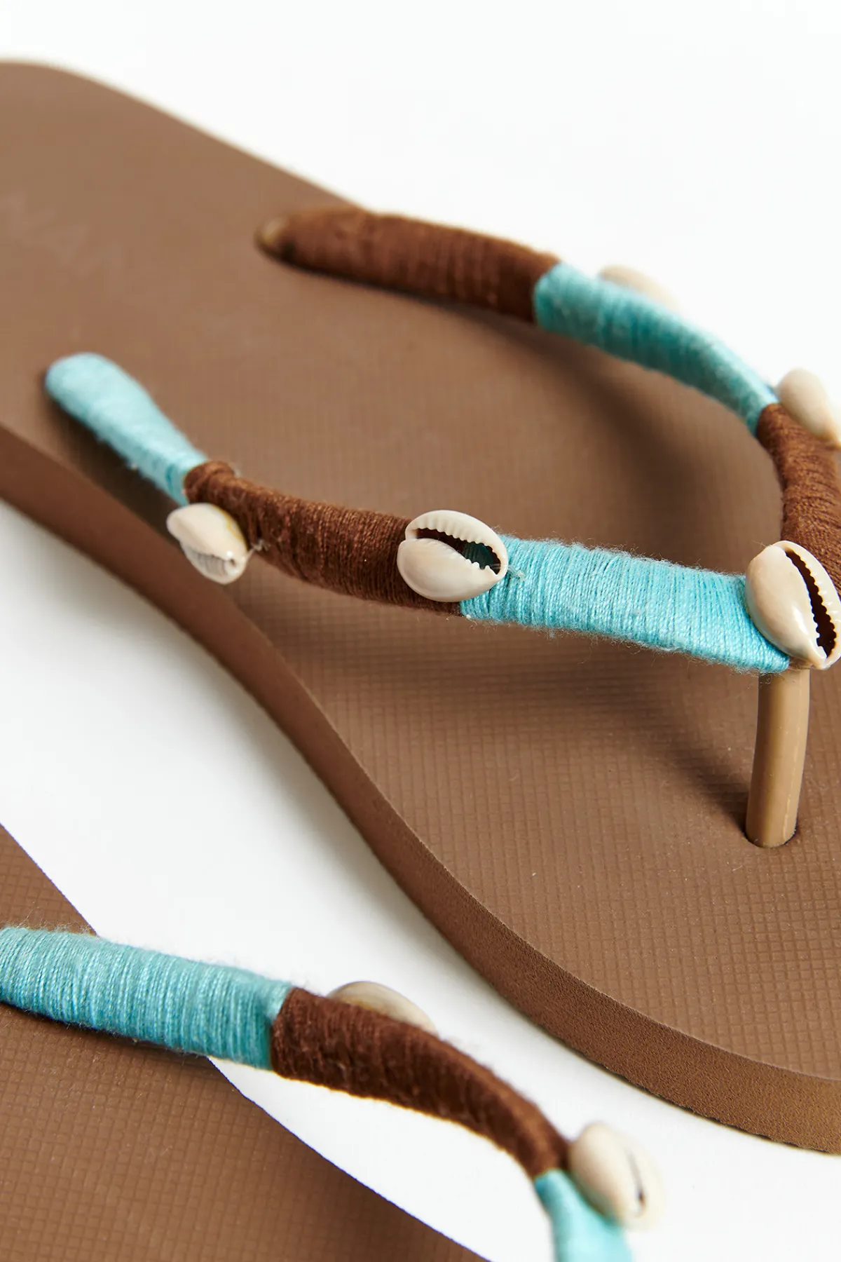 | Détails | • Tongs en caoutchouc • Bride ornée de coquillages |