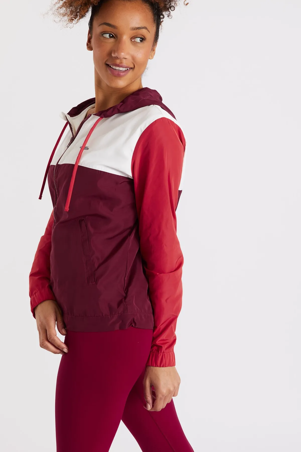 | Détails | • Veste de running • Coloris bordeaux, blanc et orange • Poches latérales avec fermeture éclair • Fermeture à zip • Capuche • Effet coupe-vent • Cordons de serrage à la taille • La mannequin mesure 1,72 m et porte une taille 36/S |